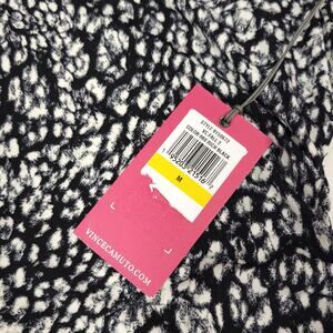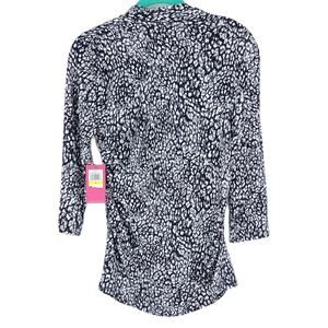 Introducing the Vince Camuto Animal Print V Neck Blouse, a stylish addition to any woman's wardrobe. This black and white blouse features a captivating animal print design that adds a touch of sophistication to any outfit. With its flattering V neck and 3/4 sleeves, this blouse offers a perfect blend of comfort and style. Designed for women's size medium, it is tailored to provide a flattering fit for a wide range of body types. Elevate your fashion game with this trendy and versatile blouse that effortlessly transitions from day to night.