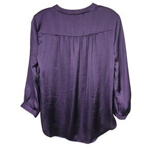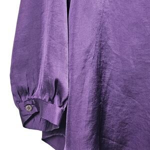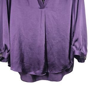 This beautiful long-sleeved blouse is perfect for upcoming holiday parties, photos, etc. Wear it with jeans for a more casual look, or with a dressy skirt, dress pants, and a blazer. The blouse by Vince Camuto was purchased at Nordstrom and never worn, so it NEW WITH TAGS. It is a Women's Size Small. The beautiful purple color is called Dark Amethyst. The blouse features a V-neck, high-low hem, and buttoned cuffs. MSRP: $74.