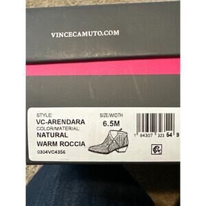 Brand new in box Vince Camuto Arendara ankle booties in a stylish natural warm roccia snake print. Made with a genuine leather upper, synthetic lining and sole, and a side zip closure for easy wear. Features a comfortable stacked block heel and a pointed toe silhouette, perfect for elevating both casual and dressy outfits. Made in Brazil.