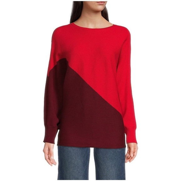 A fresh angle on the colorblock craze animates this ribbed sweater that's styled with drapey dolman sleeves and knit from cotton-blend yarn.