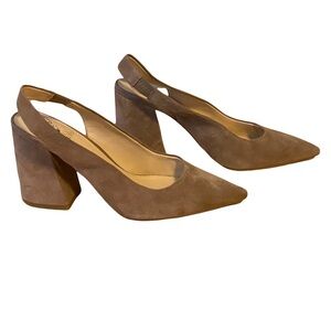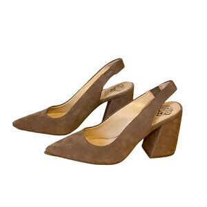 Vince Camuto ‘Bashell’ block-heel slingback pumps. Leather upper, manmade lining, and sole. Pointed toe, chunky heel. Small scratches on inner sling strap as shown in pictures. Only worn once, in excellent pre-owned condition.