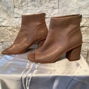 These are the Vince Camuto Bebinder open toe shooties, identified by their clean lines, square peep toe, and covered architectural block heel. They are a popular transitional ankle bootie style.