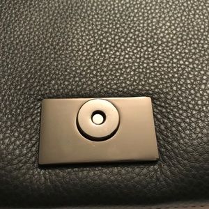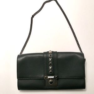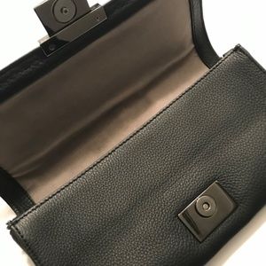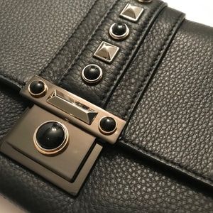 Elegant black clutch. Features silver hardware. Stylish and versatile.