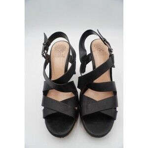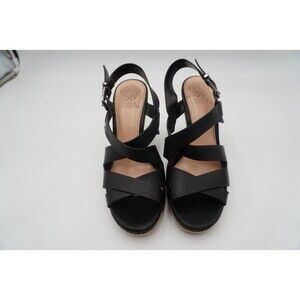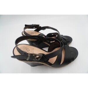 Pre-owned without tags or box Vince Camuto Black Crisscross Straps Espadrille Trim Platform Wedge size 9. These sandals feature crisscross straps made of smooth black genuine leather material. The wedges have a moderate heel height with a faux wood or cork-like finish at the sole edges, and a rope trim details.