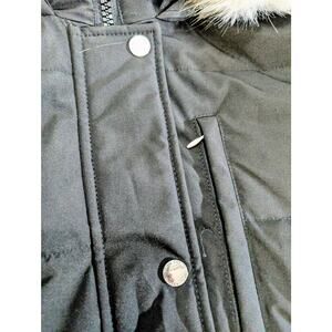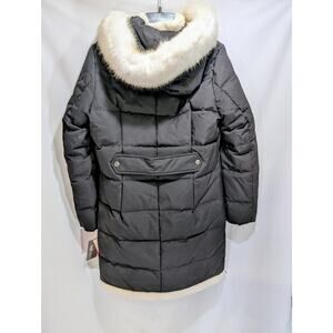 Vince Camuto black long puffer coat with faux fur hood trim and faux shearling accents at the collar and cuffs. Down-blend insulated for warmth without bulk and water-resistant to keep you dry. Removable hood.
