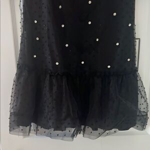 This elegant black dress features delicate pearl accents, perfect for special occasions. The sheer overlay adds a touch of sophistication.