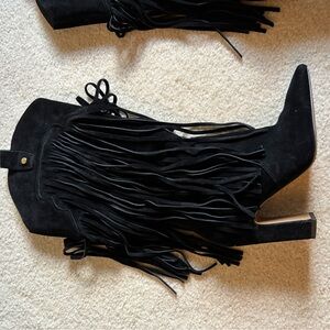 Elegant black boots with stylish fringe detail. Perfect for a bold fashion statement. Worn once for about an hour. I’m just not cool enough for these boots…