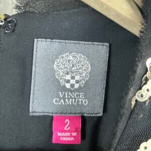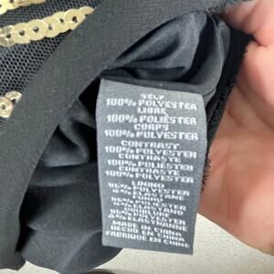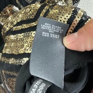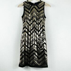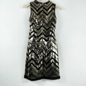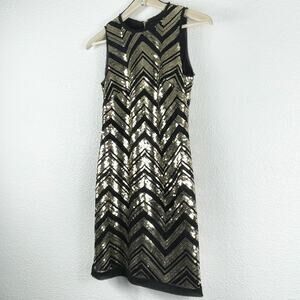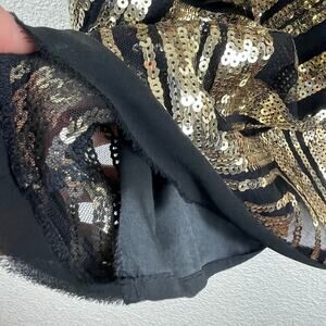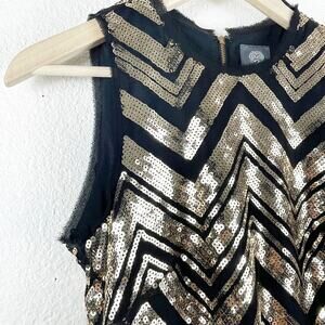 Vince Camuto Black Gold Sequin Dress Chevron Sleeveless Lined Fringe Hem Gatsby