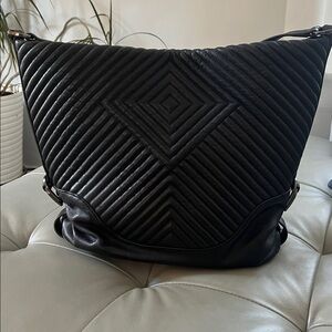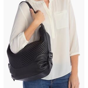 Elegant black hobo leather bag with a quilted pattern on the front, plain back, buckle details on the side. Ideal for versatile styling.