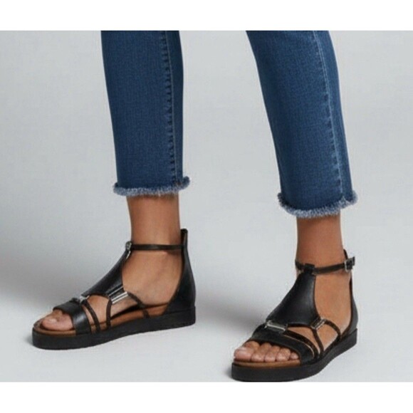 Vince Camuto Black Leather 7.5 / 8 M Flats Ankle Strap Sandals Rose Gold Resort