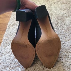 Pointy Toe black leather booties with a studded sole. Heel is 3.5 inches (if measure on the inside of heel) and 4 inches if you measure it on the back. Great condition, no box.