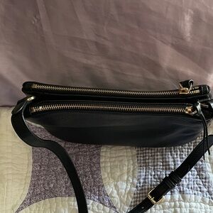 Black leather shoulder or crossbody bag by Vince Camuto. Features a sleek design with a front pocket zip pocket as well as double zipper compartments.