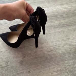 Chic dark suede heels by Vince Camuto. Features a stylish bow at the back. Perfect for elegant occasions.