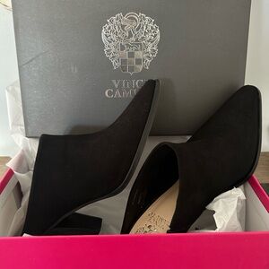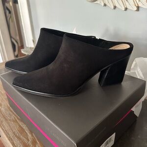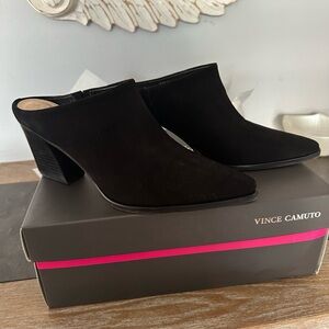 Vince Camuto black suede mules, point toe, sleek heel. Worn 3-4 times, great condition.