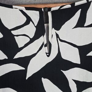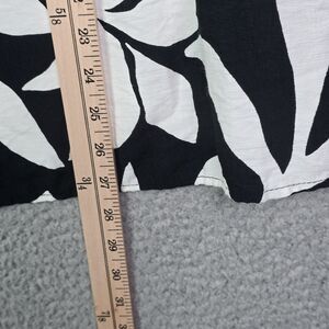 This Vince Camuto blouse stands out with its tiered ruffle sleeves and bold black and white floral-style print. The soft rayon blend offers an easy drape, and the back keyhole closure keeps the shape polished. Pre-owned with no flaws. Pairs beautifully with black pants, white denim, or a flowy skirt for work or a statement casual look.