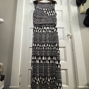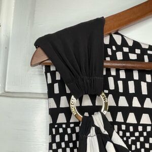 Black & white geometric print. Maxi. Surplice v-neck. Sleeveless. Wide band at waist. Gold logo rings at shoulder straps. Polyester & spandex. Machine wash.