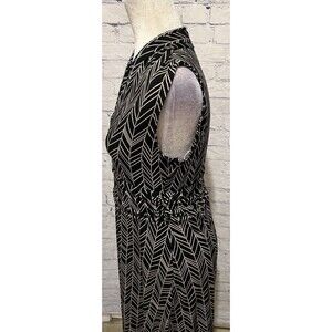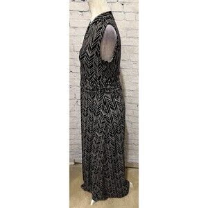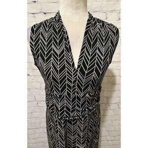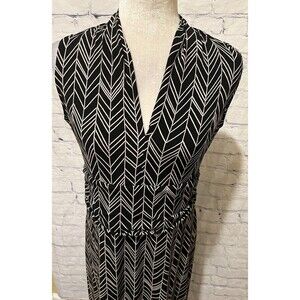 The Vince Camuto Black & White Rouched Waist Maxi Dress in size medium is a stylish and versatile piece perfect for various occasions. The geometric pattern and sleeveless design give it a modern and chic look, while the pullover closure and long length offer comfort and practicality. Made from a blend of polyester and spandex, this dress is a great choice for summer, fall, and spring events, whether it's a party, cocktail event, casual outing, workwear, or business meeting. The brand's reputation for quality and attention to detail ensures that this dress is a great addition to any woman's wardrobe. 18 inches pit to pit, 30 inch waist and 57 inches long. Smoke free home.