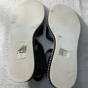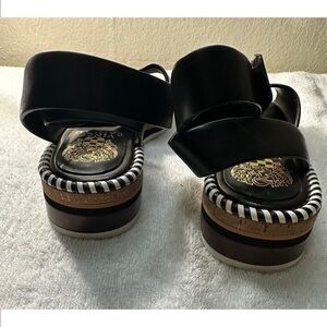 These Vince Camuto sandals feature a sleek black leather strap and a stylish ankle closure, complemented by a distinctive espadrille-style midsole. The slight platform with a brown wooden layer adds a touch of sophistication, making them perfect for versatile summer wear.