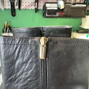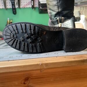 Soft black leather moto boots with gold hard wear accents. A fabulous and comfortable shoe that has fallen victim to me having too damn many pairs of moto boots. Labeled US 7.5, fits true to size. Light wear- see pictures.