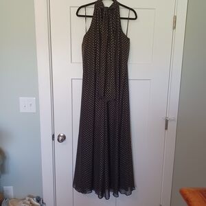This elegant halter jump suit features a classic black and gold design, perfect for any occasion. The flowing silhouette offers a flattering fit, making it a versatile addition to your wardrobe. It is a full-length jump suit with a halter tie back, hidden zipper, lined body and legs, and machine washable. It measures 58" from neckline to bottom hem and chest is 38". It is new with tags and an MSRP of $99.