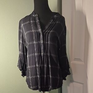 Vince Camuto Black and Gray Blouse with Cuffed Sleeves and Mandarin Collar