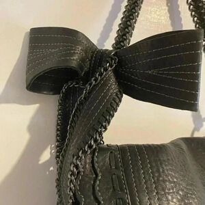 Authentic Vince Camuto Black pebbled leather shoulder handbag with gunmetal hardware 4 compartment 2 zip pocket at interior wall Snap pocket at back closure & magnetic snap closure at top black cotton lining fabric heavy metal chain with braided leather strap with Big bow at side the strap is heavy please check all photos Strap drop 13” Bag dimensions are based on approximate measurements. Before placing an order please take a moment to view all photos using zoom feature for a closer look