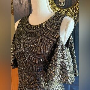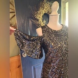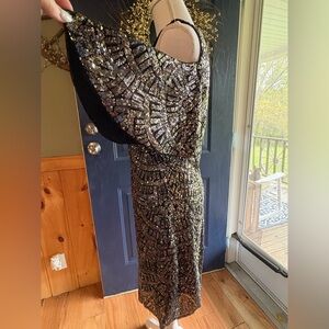 Vince Camuto Black,Gold & Silver Cold Shoulder Sheath Dress. Women’s size 6