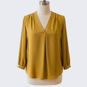 Gorgeous, NWT condition! Vince Camuto Blouse in trending Mustard Yellow (Golden Yellow). The satin-like fabric drapes beautifullyperfect for the Quiet Luxury look. A versatile 3/4 sleeve top that transitions effortlessly from office to evening. Preowned, excellent condition. Size Medium (M).