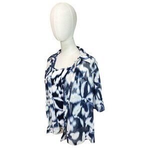 Elevate your wardrobe with this chic two-piece blouse and tank set from Vince Camuto. Featuring a lightweight, semi-sheer button-front blouse layered over a coordinating sleeveless shell, this set showcases a bold navy and ivory abstract print that’s effortlessly stylish. Perfect for pairing with white trousers for a polished office look or dressing down with denim for a weekend brunch.