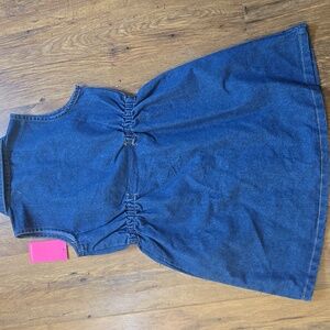 blue denim dress with a collared neckline. Features button-down front and stylish design.