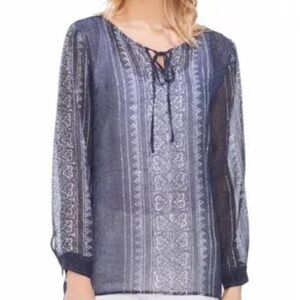 This Vince Camuto blouse features a relaxed fit with elegant puff sleeves, perfect for layering. The deep blue color adds a touch of sophistication, while the lightweight fabric ensures comfort and style for any occasion.