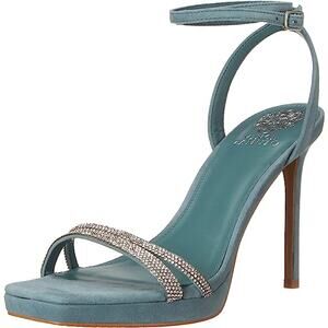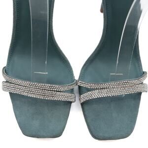 NEW WITH TAGS FEATURES: 4" stiletto heel; 1/2" platform Round-toe ankle-strap dress sandals Adjustable buckle closure Wrapping ankle strap design Suede upper; manmade lining Manmade sole APPROXIMATE MEASUREMENTS(laying flat), CONTENT, & CONDITION Size 8 Color shaded spruce Suede/rhinestones New with tags Retail $129 #0865