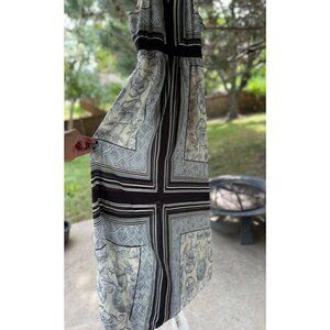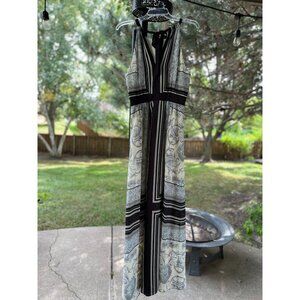 This Vince Camuto maxi dress exudes elegance with its classic black and white color scheme adorned with a sophisticated paisley print. Crafted from lightweight polyester, it offers both comfort and style. The sleeveless design is perfect for warmer days, and the flowing silhouette adds a touch of grace to any ensemble, making it an ideal choice for a variety of occasions.
