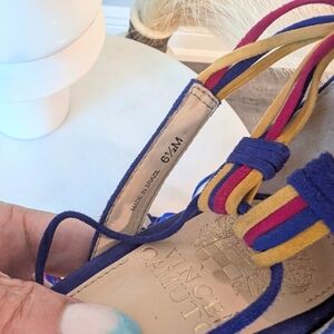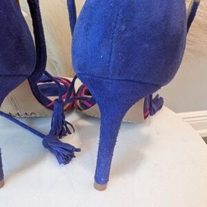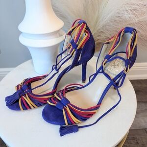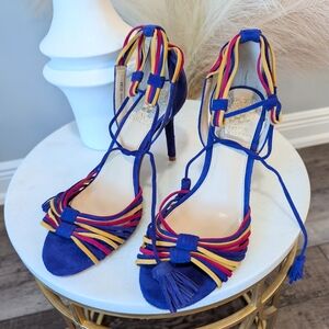 These Vince Camuto heels feature a striking combination of blue and red, with a sleek stiletto design perfect for formal occasions. The vibrant blue suede is complemented by multicolored straps, creating a woven effect across the toe area. An ankle strap with decorative tassels adds a touch of elegance to these statement shoes. show some wear on the back heel see photos. size 6.5