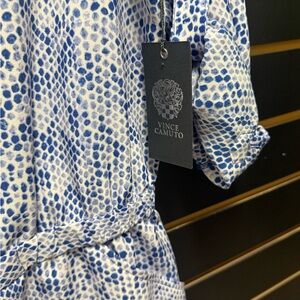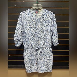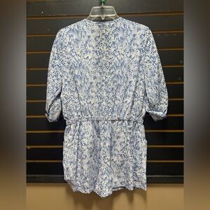 Stylish jumpsuit with a blue and white print. Features a drawstring waist and three-quarter sleeves.