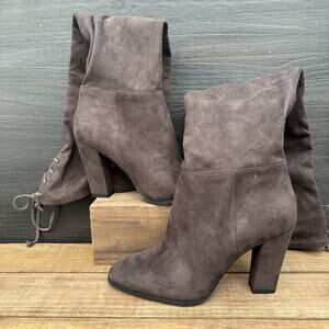 Vince Camuto Madolee Over the Knee Boot Taupe Grey Suede Side Zip US 7.5 M UK 5.5 AU 7.5 EU 38 MSRP $179 Lace Up Back Manmade Sole Made in China Slouchy Soft Suede Neutral Tone Western Date Night Evening Cocktail Comfortable Nordstrom Rack $79.97