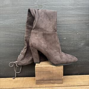 New without tags. Vince Camuto Madolee Over the Knee Boot in taupe grey. Features a slouchy soft suede fabric upper, lace-up detail on the back, and a convenient side zip. Manmade sole. Made in China. Neutral tone that complements any outfit and adds a touch of sass and edge. Perfect for western-inspired looks, date nights, evening outings, and cocktail events. Comfortable fit. Originally sold at Nordstrom Rack for $79.97 (MSRP $179).