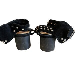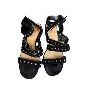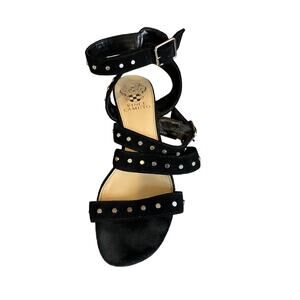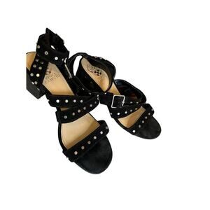 Vince Camuto Braylee Suede Studded Heeled Sandals in Black, size 6.5. Good preowned condition with sturdy block heel (2") and silver studded detail, ankle strap and buckle