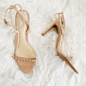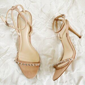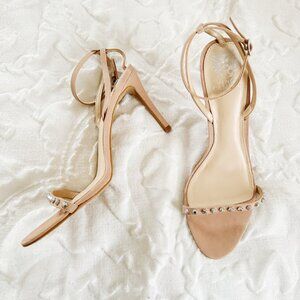 Hexagonal studs shine along the dainty leather straps of an open toe heeled sandal that features a playful ankle buckle strap closure. 3" heel Open toe Adjustable ankle strap with buckle closure Leather upper, manmade sole Imported