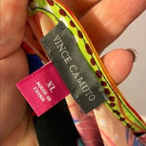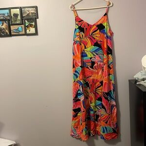 Vince Camuto Bright Colorful Tropical Foliage Maxi Dress size XL. Very good preowned condition. Rainbow of colors leaves all over design. Spaghetti straps. V neckline front and back. Pullover style. See pictures for approximate measurements. Length approximately 55 inches from top of strap. Gorgeous flowy dress. Vacation. Summer. Cruise. Work.