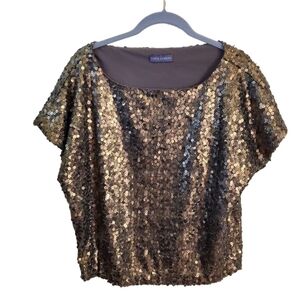 Vince Camuto Bronze Sequined Top, Size M. Fully Sequined, Boat Neck, Dolman Short Sleeve, Fully Lined, 22" pit to pit, 22" shoulder to hem. Good Pre-Owned Condition