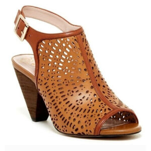 Step into style with these chic Vince Camuto leather cutout sandals. Featuring a peep-toe design, adjustable ankle strap with buckle closure, and a stacked block heel, these sandals are perfect for pairing with dresses, jeans, or office wear. The intricate cutout design adds breathable comfort and standout flair.