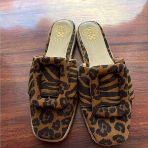 These Vince Camuto mules feature a striking brown leopard print, offering a bold and fashionable statement. Crafted with a comfortable slip-on design, they are perfect for casual outings. The decorative bow detail adds a touch of elegance to these stylish shoes.