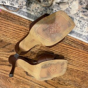 These Vince Camuto mules feature a sophisticated quilted leather design in a rich brown hue, offering a chic square-toe silhouette. The medium-height heels provide a perfect balance of elegance and comfort, making them ideal for both casual and dressier occasions.