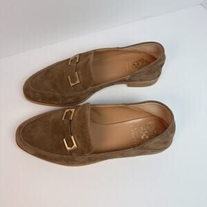 Vince Camuto Cakella Leather Loafer, size 7.5M. These sophisticated, comfortable loafers are crafted from supple Harvest (a rich, warm tan/brown) leather. The classic loafer silhouette features a stylish keeper strap detail and a flexible sole, perfect for all-day wear. Ideal for professional attire, smart casual looks, or driving. A high-quality wardrobe staple offering comfort without sacrificing style.
