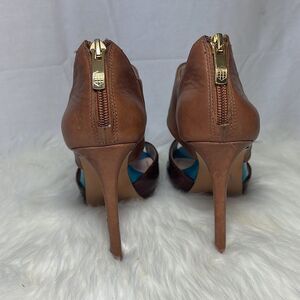 Heel height is 4.25". In very good pre-owned condition. Normal wear and tear noted, but no flaws or damage. Please review pictures and feel free to ask any questions or for more pictures prior to purchasing.