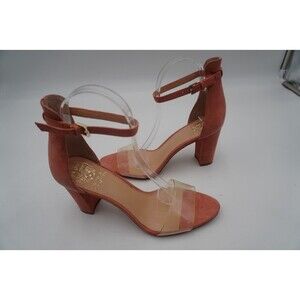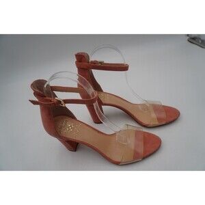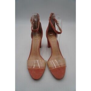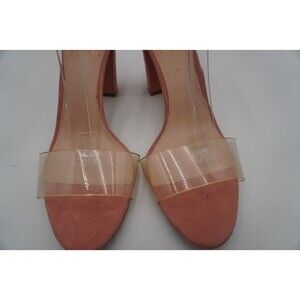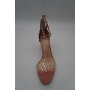 Pre-owned without tags or box Vince Camuto Caroline Clear Toe Top Pink Suede Ankle Strap Block Heels Size 8.5. Stylish women's block-heeled sandals in pink suede finish. These open-toe shoes feature a modern design with a clear, wide PVC strap across the toes for a trendy, barely-there look. The ankle strap is made from the same suede material and includes a small gold buckle for an adjustable and secure fit. The heels are sturdy and medium-high, offering a balance between style and comfort. These heels are suitable for both casual chic and semi-formal occasions.