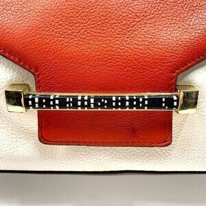 Eye catching color blocked Vince Camuto crossbody with 1960's mod Squad vibes in white, coral (red-orange) and gray pebbled leather. Front flap slips through a decorated latch. Under the flap is a metal snap closure. Inside the bag is lined in VC signature gray fabric with white leather piping. The bag has 1 zip and 3 slip pockets. The crossbody strap is adjustable with a buckle 20"-22"L. Just gorgeous!