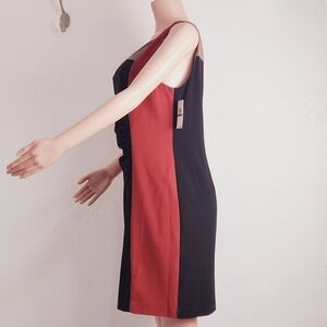 Color block Vince Camuto dress. Classic colors transition from a business meeting to a cocktail affair. Above the knee length, with a zipper and eye hook in the back. Pleating at the front of the waist.