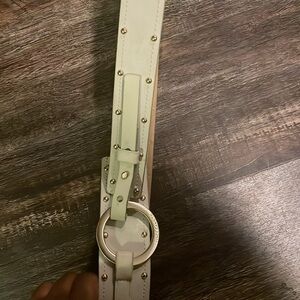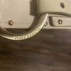 Elegant Vince Camuto belt. Cream strap with gold studs. Features a bold round buckle.